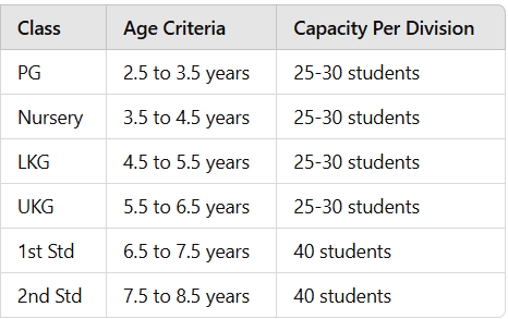 The Charoli campus offers classes from Playgroup (PG) to 2nd Standard. The age criteria for admission are as follows: